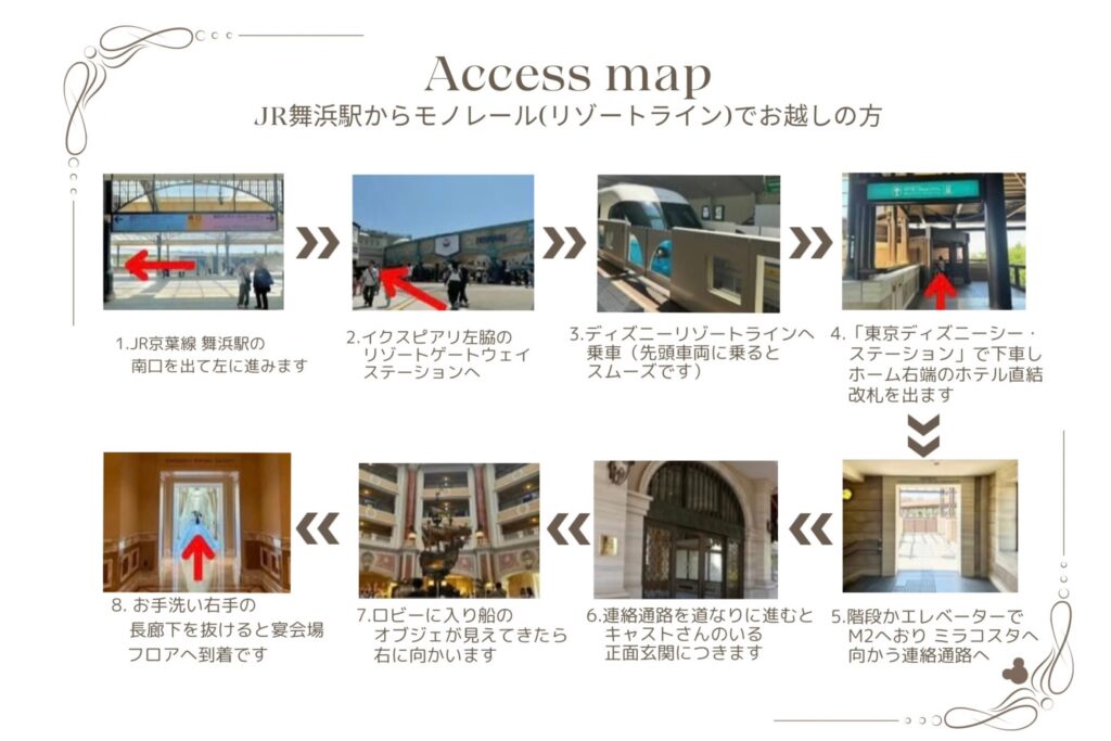 ⑦アクセス案内:舞浜駅からリゾートラインを使う場合と、車で来る場合の案内を作成して