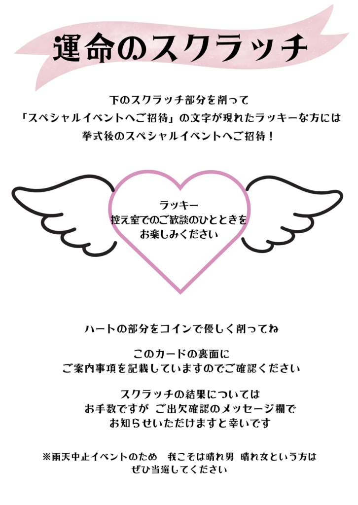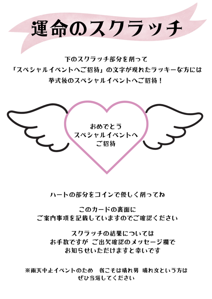 私たちはオプションでゴンドラ乗船を付けていたのですが、どう頑張ってもパークに一緒に入れる友人を絞ることが出来なくて💦 運の良い人でいいのでは?とスクラッチくじを作りました。